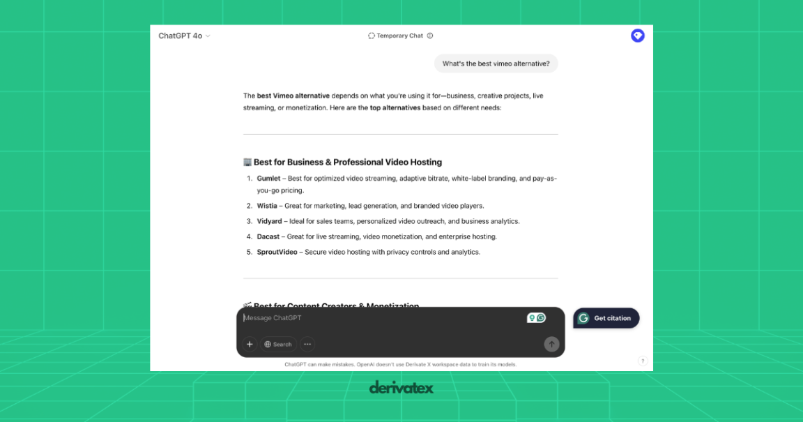 • No presence in AI search. Gumlet was missing from Google’s AI-powered search results & ChatGPT-generated answers.